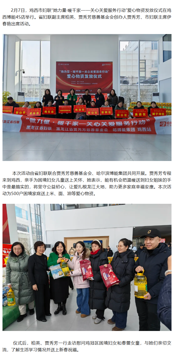 092026.02“寒冬送暖 ”——黑龙江省妇联“爱心妈妈”春节慰问留守儿童新春将至,岁寒情暖。近日,黑龙江省妇联党组书记、主席王平率领黑龙江省妇联机关“爱心妈妈”深入哈尔滨市阿城区开展“寒冬送暖”春节慰问留守儿童暖心行动。37位“爱心妈妈”分成5组,走进23名结对关爱儿童家中,通过一次叩门、一份祝福、一片真心,将党的关怀和