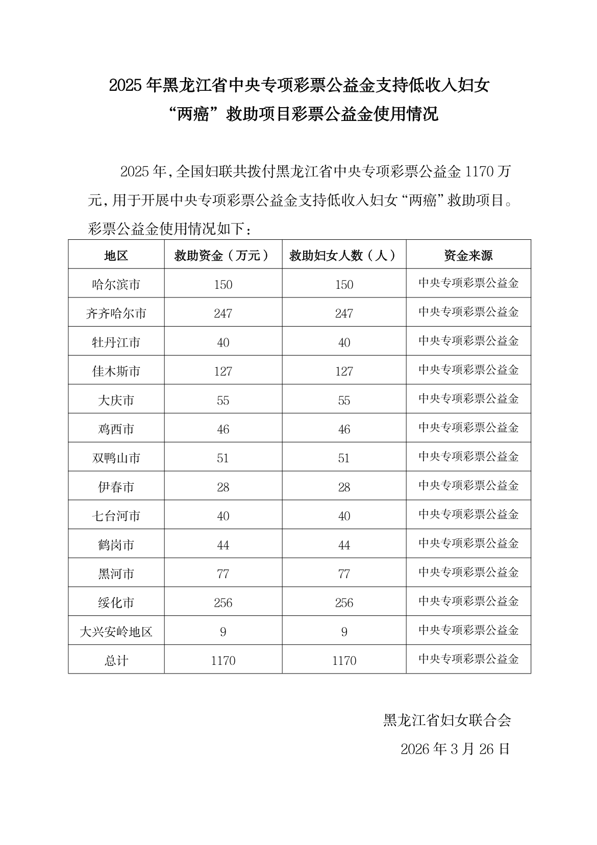 262026.032025年黑龙江省中央专项彩票公益金支持低收入妇女“两癌”救助项目彩票公益金使用情况